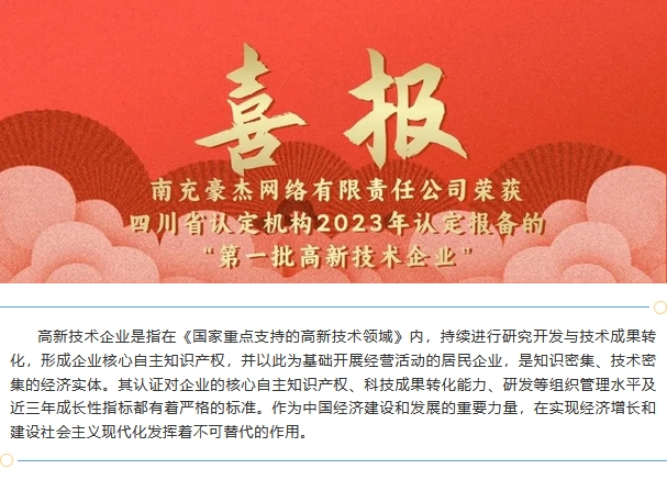 喜報|南充豪杰網(wǎng)絡(luò)有限責(zé)任公司榮獲四川省認定機構(gòu)2023年認定報備的“第一批高新技術(shù)企業(yè)”